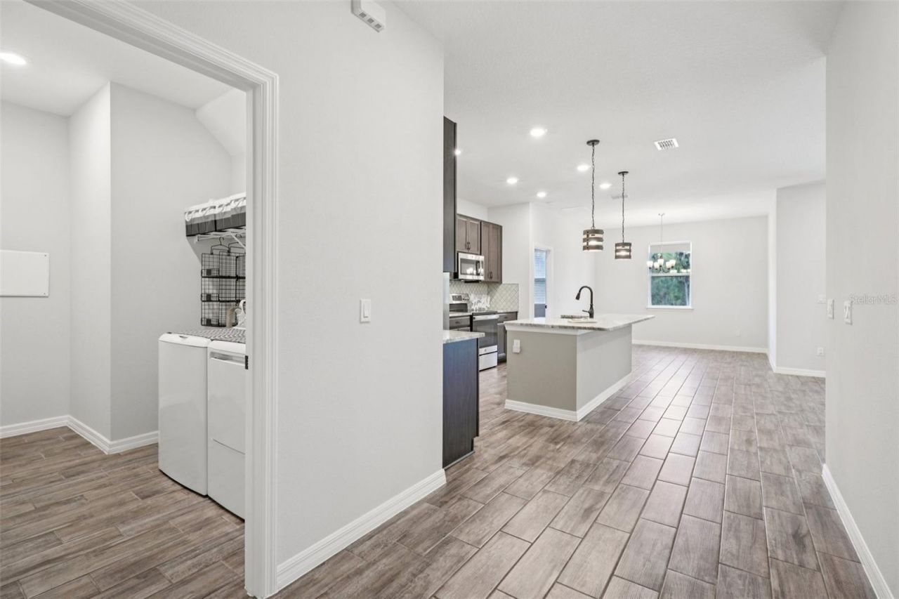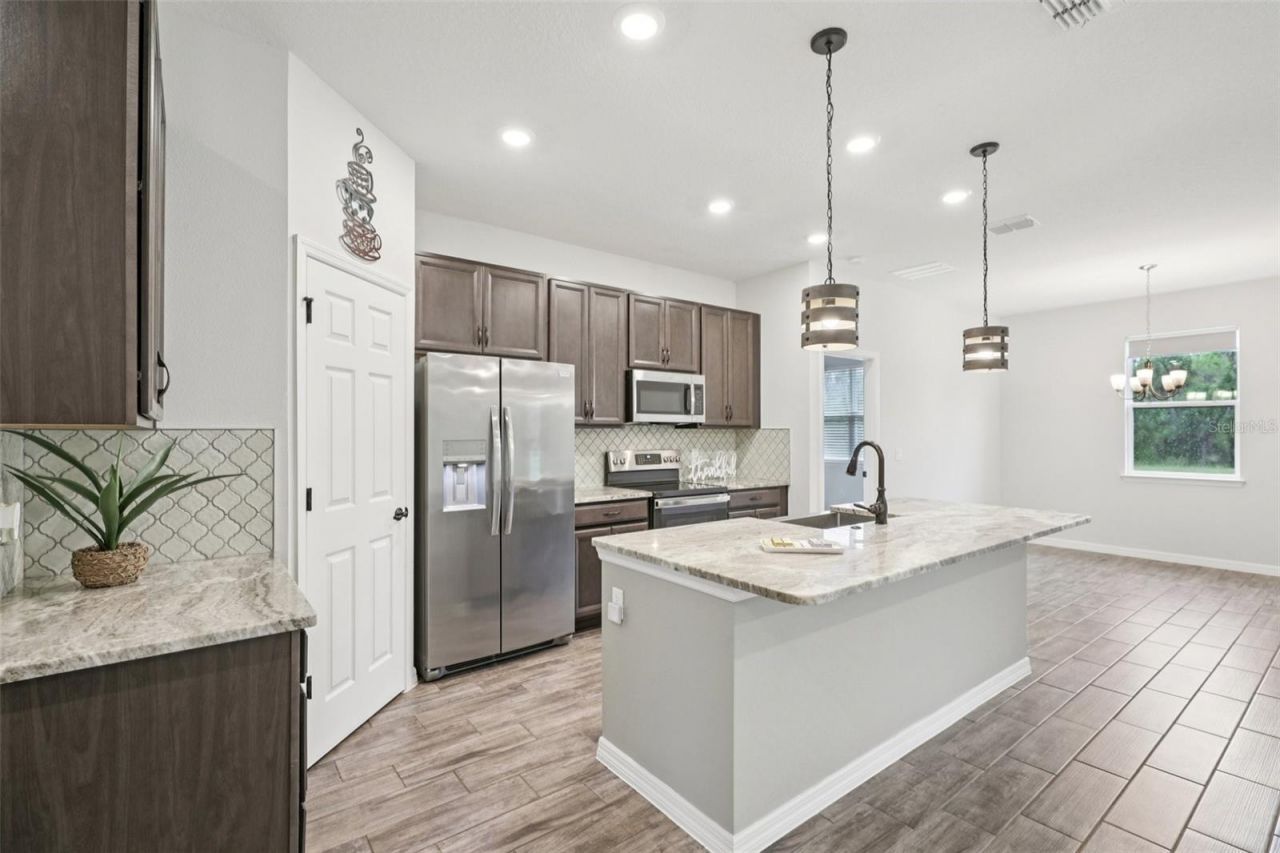 Welcome home to this well maintained, LIKE NEW one-story retreat nestled on a quiet interior lot in Leesburg's Lake Denham Estates. Inside you're greeted with soaring ceilings and an abundance of natural light, creating an airy atmosphere complemented by a neutral color palette and wood look tile flooring. Centering the open floorplan in the eat-in kitchen complete with granite countertops, SS appliances, farmhouse sink and a walk-in pantry; flows seamlessly into the family room, offering the perfect layout for both daily living and effortless entertaining.The thoughtful split floorplan prioritizes privacy, positioning the two spacious guest bedrooms away from the primary suite, which has its own ensuite with dual vanity, tile shower and walk-in closet. Outside, the expansive backyard is a rare find, featuring a covered patio and NO rear neighbors. Ideally located, you are just minutes from the community pool, playground, and the boat ramps at Griffin State Park, with quick access to major transportation routes for an easy commute. This home will not last, Tour today!