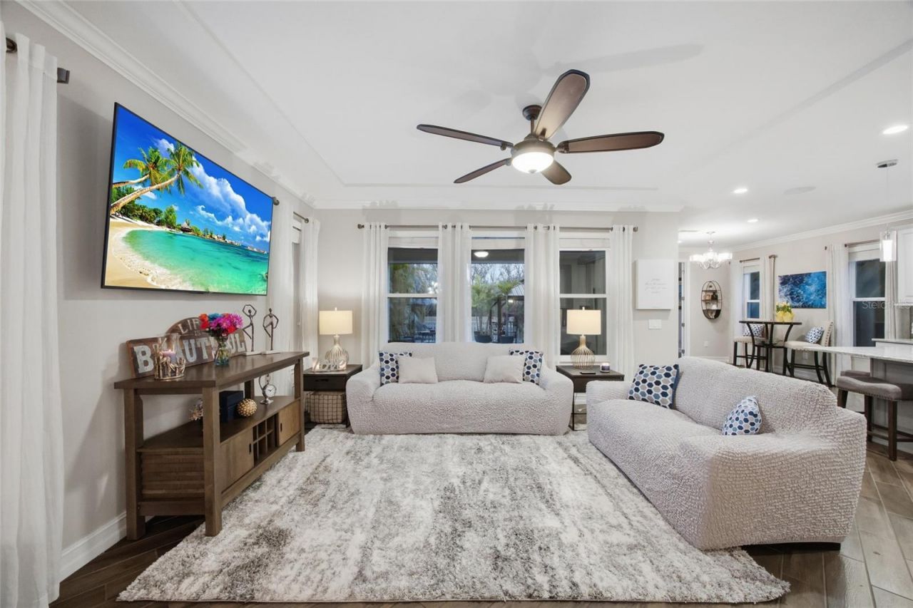 Welcome to your dream home in the highly sought-after gated community of The Promenade At The Lake Park! This stunning 4-bedroom, 3-bathroom home offers the perfect blend of luxury, comfort, and privacy. As you enter, you're greeted by soaring ceilings, elegant archways, and an abundance of natural light. The open floor plan features a formal dining room, a spacious living area, and a chef's kitchen complete with quartz countertops, stainless steel appliances, a large center island, and wood cabinetry - perfect for entertaining or family gatherings. Retreat to the primary suite boasting coffered ceilings, sitting area, large walk-in closets and a spa-like ensuite bathroom. Step outside to your private covered lanai, ideal for enjoying Florida's beautiful weather all year round. Enjoy a glass of wine in the heated hot tub, shaded and protected under the gazebo. Patio has been plumbed along with gas and electric hook-up for outdoor kitchen. Additional highlights include a high-tech whole home surround sounds system, a 3-car garage, dedicated home office or bonus room, concrete tile roof, and low HOA fees with no CDD. Conveniently located near top-rated schools, shopping, dining, and major highways for an easy commute to Tampa, Tampa Airport and St. Petersburg. Don't miss your opportunity to own this exquisite property in one of Lutz's premier neighborhoods.