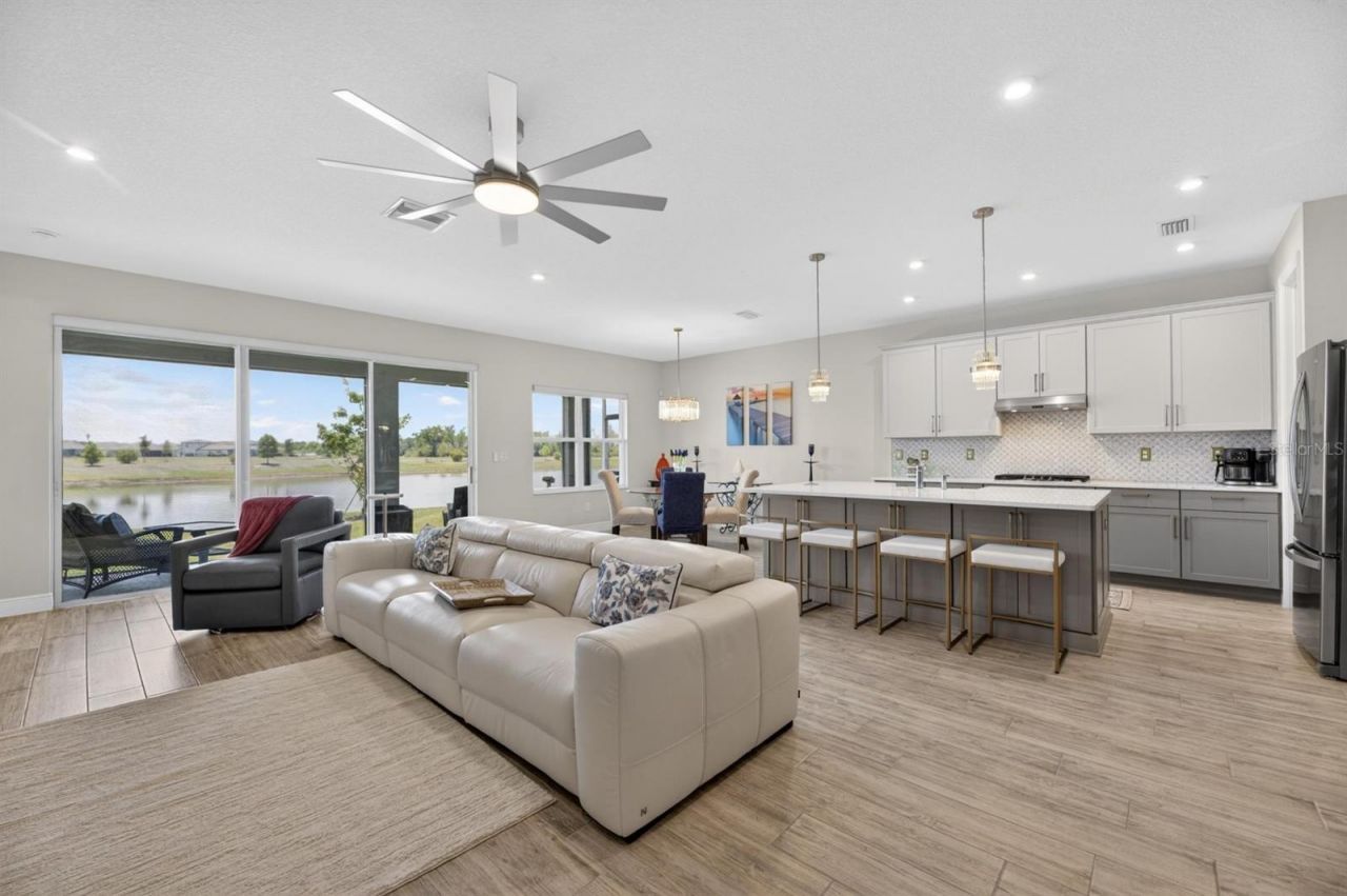 Imagine waking to the soft ripple of water just beyond your backyard, where privacy wraps around you like a quiet promise. This Brighton model by Cardel Homes sits on a rare $20,000 premium water-view lot in Waterset, with no rear neighbors to interrupt the serene expanse. Builders no longer offer lots like this on 50-foot homesites, and you could not recreate this home today at this price. Priced to sell, it blends nearly new construction, modern efficiency, and award-winning quality, fresh from the 2025 Parade of Homes Grand Prize winner. Step onto the oversized screened lanai, extended for those lingering evenings of conversation or quiet reflection, with tranquil views unfolding ahead. TV and cable connections make it effortless to settle in with a game or sunset playlist. Inside, wood-look porcelain tile guides you through an open layout that feels expansive yet intimate. The gourmet kitchen anchors it all: Cambria quartz countertops gleam under upgraded lighting, a gas cooktop and wall oven invite family meals, and the extended island with soft-close cabinetry and walk-in pantry keeps everything within reach. A wine and beverage refrigerator waits for your favorites, while surround sound wiring threads through the living room, primary suite, and lanai, setting the stage for easy gatherings. The primary suite unfolds as your private sanctuary, with a freestanding soaking tub, floor-to-ceiling tiled shower, and custom closet touches that turn routine into ritual. Tray ceilings grace the foyer, 8-foot doors frame every entry, and thoughtful details such as a floor outlet in the living room, a security system, and laundry plumbing for a sink elevate daily life. Post-builder refinements shine through: upgraded fixtures and fans, auto shades on sliders and the dining window, porcelain tile in bedrooms and den, and a fully enclosed lanai. Three-plus bedrooms, two baths, and 2,010 square feet position you perfectly amid Waterset's vibrancy. Three-plus bedrooms, two baths, and 2,010 square feet position you perfectly amid Waterset's vibrancy, minutes from the Sports Complex, new Town Center with dining, coffee, and shops.